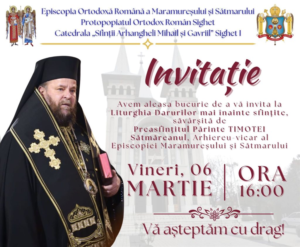 Vineri 6 Martie ora 16.00 Preasfințitul Părinte TIMOTEI SĂTMĂREANUL Arhiereu Vicar al Episcopiei Ortodoxe a Maramureșului și Sătmarului, Va săvârși Sfânta Liturghie a Darurilor mai înainte sfințite în Catedrala Ortodoxă Sfinții Arhangheli Mihail și Gavriil – Sighetu Marmației. Vă așteptăm