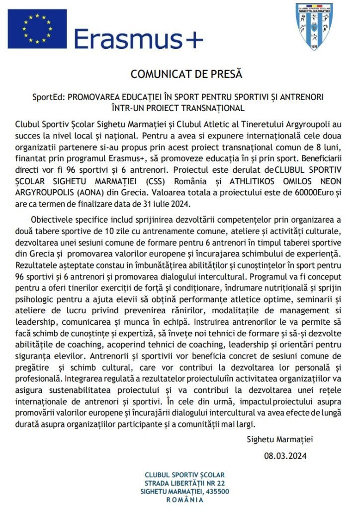 COMUNICAT DE PRESĂ   SportEd: PROMOVAREA EDUCAȚIEI ÎN SPORT PENTRU SPORTIVI ȘI ANTRENORI ÎNTR-UN PROIECT TRANSNAȚIONAL Clubul Sportiv Școlar Sighetu Marmației și Clubul Atletic al Tineretului Argyroupoli au succes la nivel local și național. Pentru a avea si expunere internațională cele doua organizatii partenere si-au propus prin acest proiect transnațional comun de 8 luni, finantat prin programul Erasmus+, să promoveze educația în și prin sport. Beneficiarii directi vor